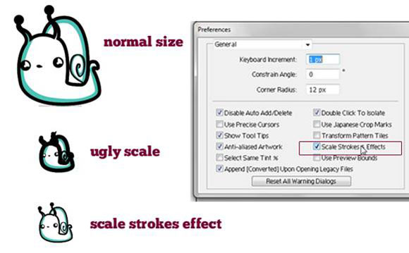 По умолчанию Illustrator не масштабирует толщину контура. Например, когда вы будете масштабировать объект с обводкой 10px, размер контура будет оставаться тем же, независимо от нового размера объекта. Это выглядит довольно уродливо. К счастью, у Illustrator-а есть возможность это исправить, которая называется «Scale Strokes & Effects». Для того, чтобы включить или отключить ее перейдите в Edit> Preferences> General и поставьте (или уберите) галочку возле «Scale Strokes & Effects». Теперь вы можете масштабировать объекты, при этом контур останется пропорциональным.