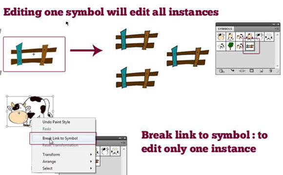 Если вы хотите изменить только один экземпляр символа, щелкните правой кнопкой мыши на объекте, затем выберите «break link to symbol». Помните, что этот объект больше не является символом, так что любые изменения будут применены только к данному объекту.