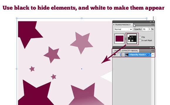 Эта маска работает точно так же, как в Photoshopе: используйте черный цвет, чтобы скрыть элементы, и белый, чтобы показать. Вы можете играть с прозрачностью элементов, использовать градиент, и т.д. В приведенном ниже примере была создана маска путем добавления черно-белых звезд к маске с различной степенью прозрачности: