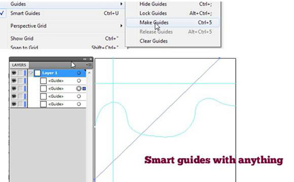 Smart Guides («Умные направляющие») – это не линии (Guides), а объекты с «липкими» (магнитящими) краями и точками, аналог функции Snap to Objects (Привязка/подлипалка к точкам объектов) в CorelDRAW! При включённых Smart Guides легко строить новые объекты от точек и краёв уже имеющихся)))