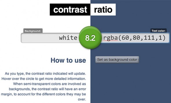 Вы вводите значение цвета его названием (black, white, grey) или же цифровым значением HEX/RGB для текста и для фона. Более того, вы даже можете указать повторяющийся фон при помощи url(). Вы сразу же сможете увидеть как будут смотреться цвета и насколько они контрастны. Также степень контрастности будет указан на экране в диапазоне от 0 до 100.