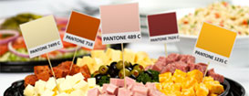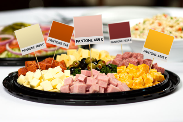 Этот вариант подходит, если на вашем столе предполагаются закуски, которые можно разделить по цветам. Разложите отдельно цветную еду и укажите цвет этой еды в палитре PANTONE. Вам понадобятся деревянные зубочистки или шпажки, плотная бумага и цветной принтер. Распечатайте таблички на бумаге в двух экземплярах и склейте их вместе, поместив между двумя бумажными квадратами зубочистку.