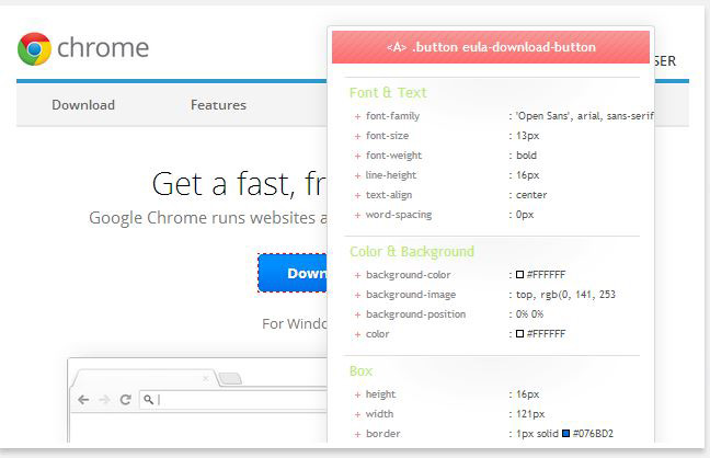CSSViewer — крутое расширение, которым очень легко пользоваться. Вы просто кликаете по иконке на панели, затем наводите мышь на любой элемент, чей код хотите просмотреть.
