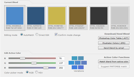 ColorBlender -инструмент для создания палитры из шести цветов, которую дизайнеры могут скачать в формате .atc для Фотошопа, .epc для Иллюстратора или отправить на электронную почту. Установите оттенок для каждого цвета при помощи ползунка или укажите сами его значение.