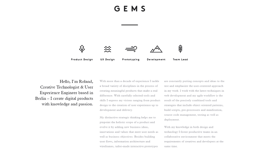 Этот темный стильный сайт наполнено всевозможными развлекающими мелочами, анимацией и эффектами взаимодействия. Интересно и приятно искать и находить их. Сразу становится понятно, что имеете дело с дизайнером, который любит свою работу. Откройте страницу с проектами, там вы также найдете интересную закулисную информацию о выборе дизайна.
