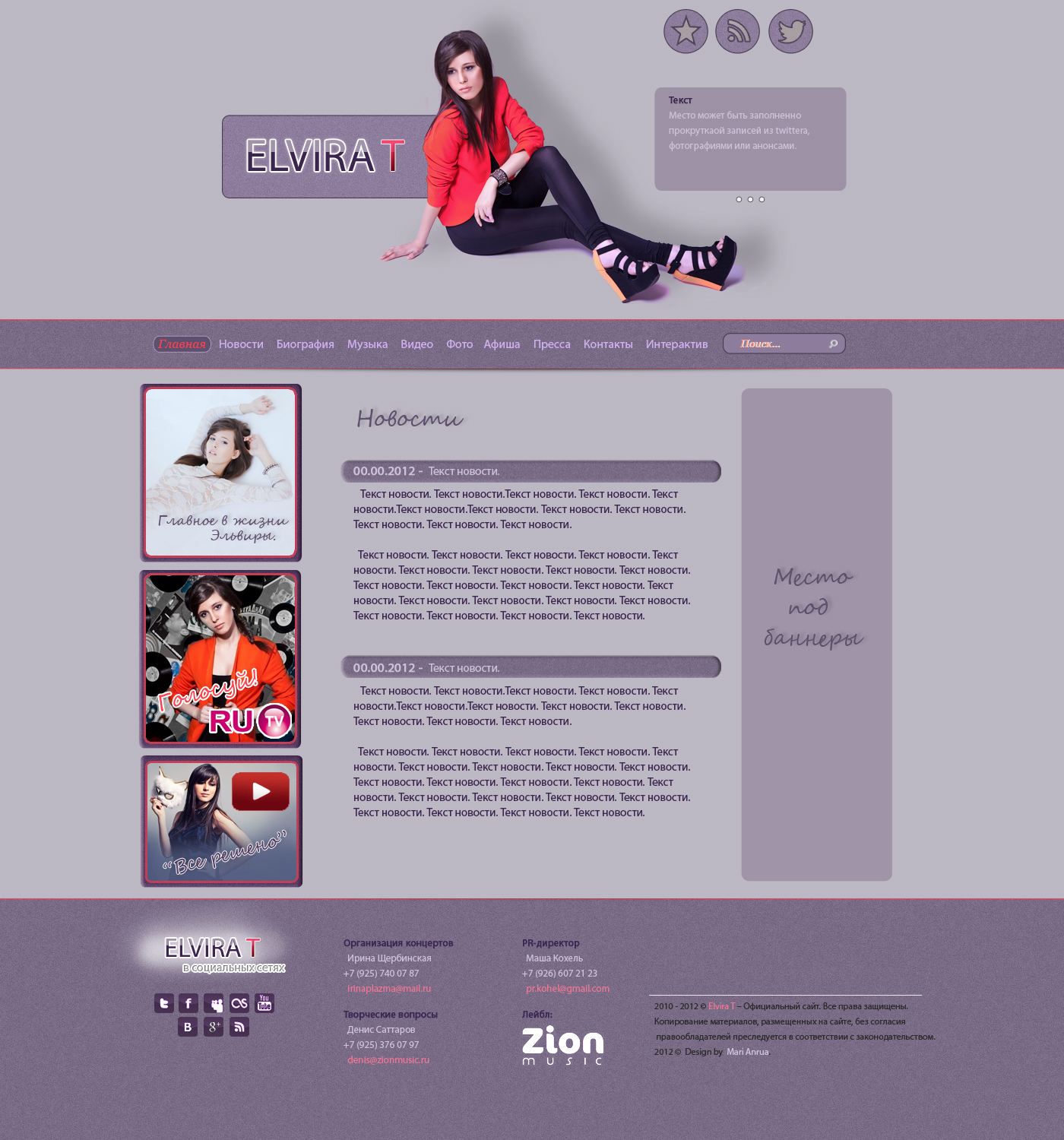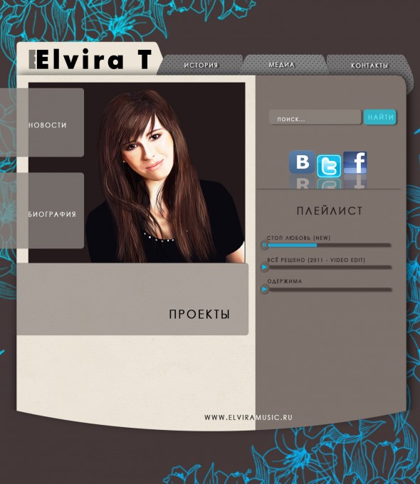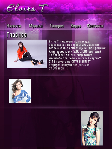 Не так давно Дежурка совместно с порталом CityCelebrity объявляли конкурс на лучший дизайн сайта для певицы Elvira-T. На конкурс было подано более 40 вариантов дизайна главной страницы для сайта Эльвиры. Команда Эльвиры выбрала победителя. Сегодня мы хотим познакомить вас с результатами конкурса.