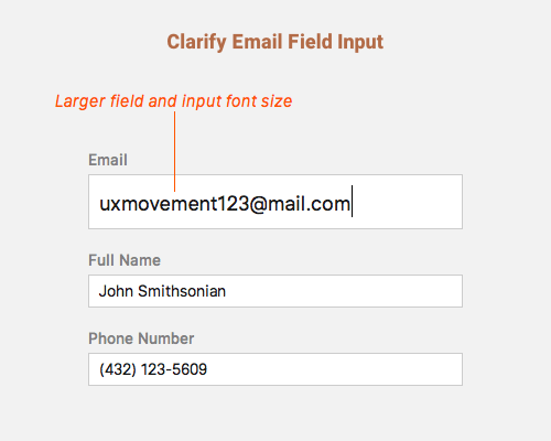 Вы можете сделать поле для почты больше чем остальные поля. Правда это может лишить последовательности стиль всей страницы. Чтобы избежать этого, сделайте так, чтобы поле увеличивалось в момент его активации для заполнения. Шрифт вводимых символов тоже должен становиться больше. После того как пользователь снимает выделение с поля, оно возвращается к обычному размеру.