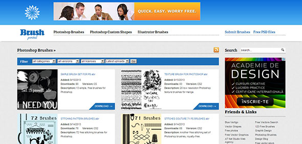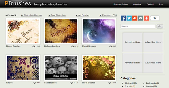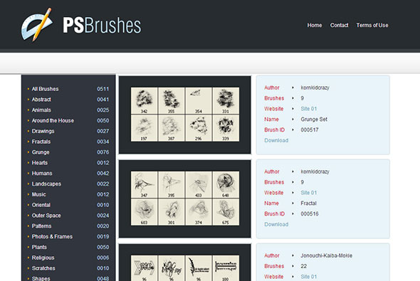 brushking.eu достаточно удобная навигация. Еще в меню категорий можно увидеть количество представленных в них кистей. Также можно выстроить предложения по дате публикации, количеству просмотров, частоте скачиваний или же в алфавитном порядке.