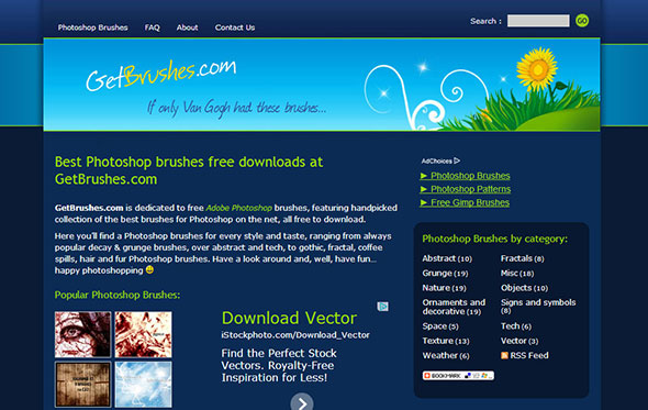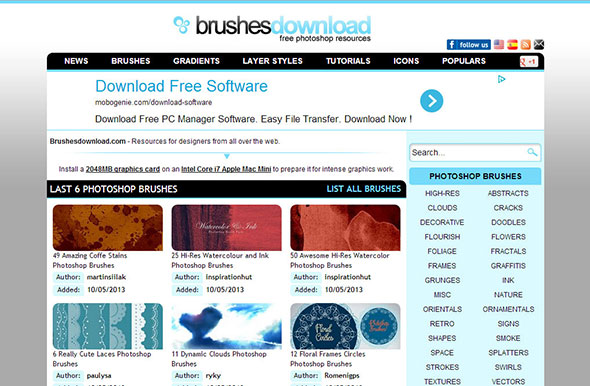 Преимущества brushesdownload.com в том, что он довольно часто обновляется и выбор кистей широк. Однако есть у портала и существенный минус. Кисти не хранятся на местном сервере. Все что вы найдете на сайте собрано с других ресурвос и лежит там же. То есть вы получите ссылку на ресурс, которая может не работать за давностью лет.