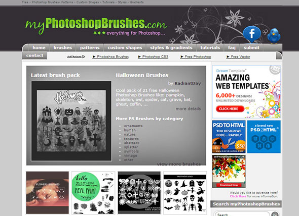 На сайте myphotoshopbrushes.com тоже можно просто полистать предложенные кисти — по картинкам-превью вполне реально составить представление о инструменте. Также есть сортировка по категориям (коих 9 штук) и дате или популярности.