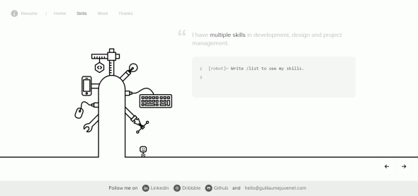 Так как эти элементы выглядят просто, они создают общее ощущение минимализма в дизайне. Вместо использования слов для того, чтобы донести свою идею словами, Guillaume использовал картинки. Тем самым он не только сделал интереснее посыл, но и продемонстрировал свои навыки, сделав контент частью дизайна.