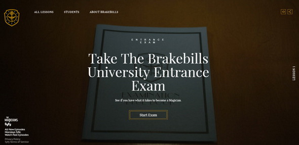 Сайт продвигает неплохой сериал под названием «Волшебники» (“The Magicians”). Здесь все строится на повествование с интерактивными деталями, множеством видео и картинок. Можно пройти урок, прогуляться по университету и т.д.