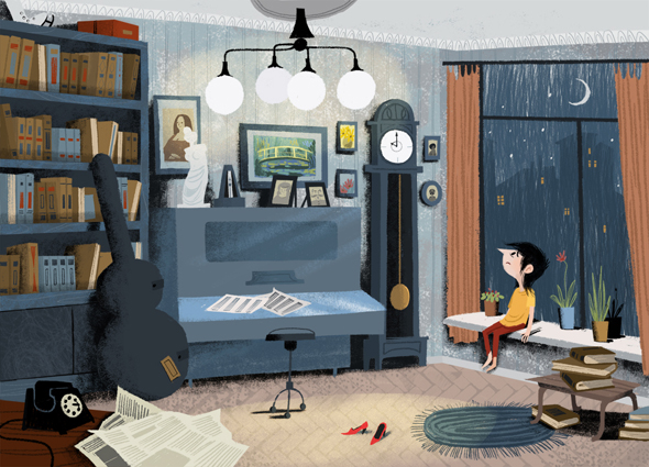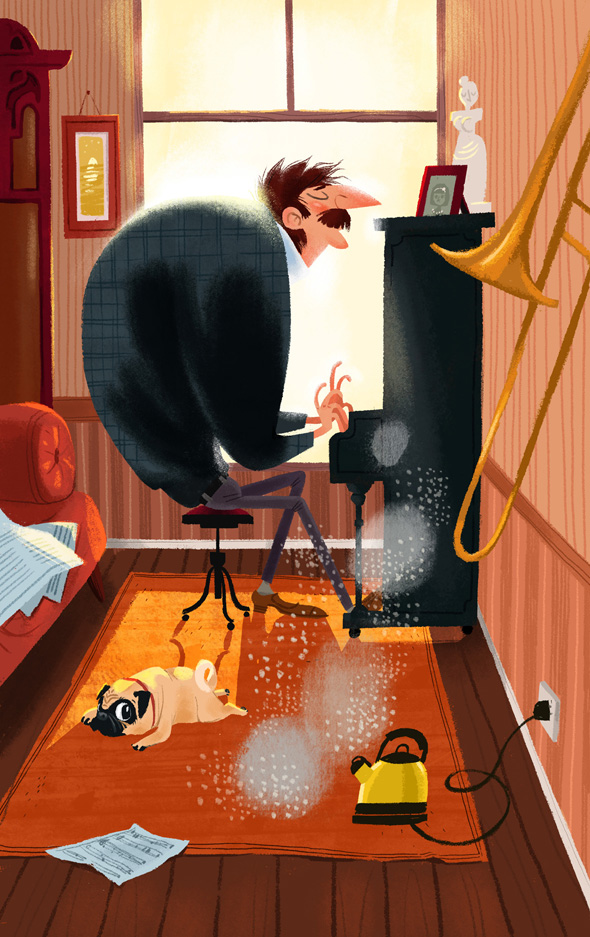 Я думаю все увиденное в реальной жизни, так или иначе, отражается в иллюстрациях. Обычно это не прямое перенесение реальной истории, а интерпретация ощущений от той или иной ситуации, может быть даже нескольких событий. Я люблю смотреть старые фотографии, иногда подсматриваю сюжеты там, добавляя какие-то свои соображения. Пожалуй, единственная пока работа, в которой я сама легко могу понять «откуда ноги растут», это картинка про пианиста. В детстве у нас было пианино, и когда в гости приходил дядя, он на нем играл. Мне казалось что в комнате в этот момент расцветают цветы, светит ярко солнце, даже если его нет, и дышать становится легче. Вот это ощущение и захотелось передать, добавив, конечно, своих мечтаний.