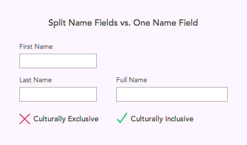 Структура имени разнится от народа к народу. Если ваш сайт рассчитан на многонациональную аудиторию, вам нужно учитывать этот момент. Отсутствие должного подхода в создании формы заполнения, может оттолкнуть потенциальных клиентов. Принцип «два лучше одного» действует во многих сферах жизни, однако к полям ввода имени не подходит.