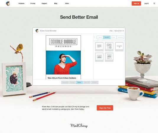 MailChimp использует настольные элементы, чтобы вызвать у клиентов человеческие ассоциации с приложением и соотнести себя с брендом.