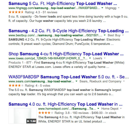 При поиске “samsung top load washer” («samsung стиральные машины с вертикальной загрузкой»), вы заметите что некоторые сайты предоставляют рейтинги, количество отзывов, цену и указание того есть ли товар на складе. Эта информация предоставляется для поисковой системы и увеличивает ваш рейтинг, потому что обеспечивает ценную информацию для пользователя.