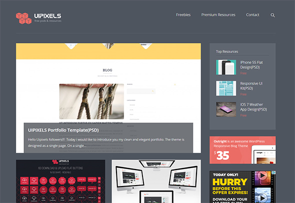 Uipixels также посвящен исходникам для дизайнеров, в частности элементам UI. Среди бесплатных ресурсов встречаются премиум файлы, но их не так уж много. Каталога как такового нет, поиск необходимого осуществляется при помощи тегов и строки поиска.