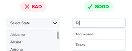 Строка автозаполнения в этом примере лучше, потому что экономит пользователям время, дают возможность быстрее выбрать необходимый пункт. Посетителю нужно только начать вводить первые символы, и у них уже появятся варианты. Теперь они могут нажать клавишу «вниз», чтобы выбрать то, что им нужно.