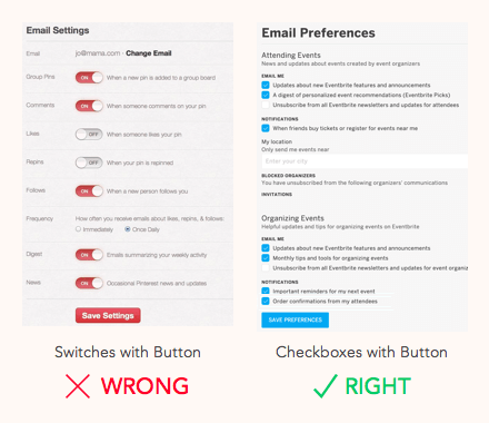 Переключатели никогда не должны требовать от пользователя нажать еще и на кнопку, так как переключатели сами по себе являются кнопками переключения. Если вы заставляете пользователя нажать еще и кнопку сохранения, вы путаете его, так как он этого не ожидает.