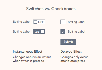 Переключатели всегда показывают включена и отключена опция. Когда пользователь переключает функцию в положение «on/вкл», он ожидает эффекта мгновенно — в тот же момент, когда сработал переключатель. Эта схема работает не только с онлайн-переключателями, но и с настоящими переключателями.