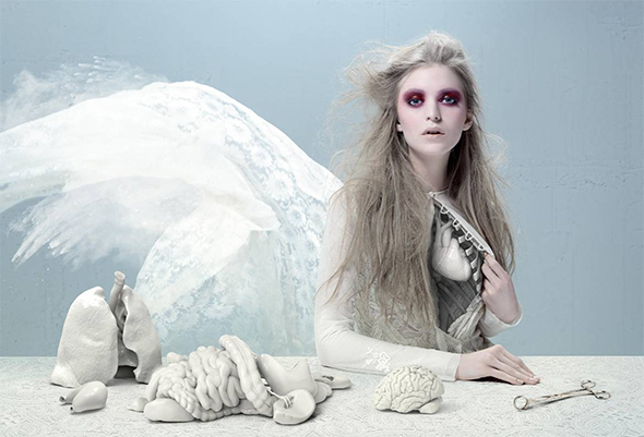 «В наши дни молитву и исповедь заменили детокс-чистки и диеты – все во имя очищения загрязненной окружающей среды от наших тел», – объясняет MatCloud. «Героиня нашей работы страдает, почти как мученик, относясь к своим органам как к эмблеме или медали за набожность, вроде «Ордена Священного сердца», – продолжает Джиачани. MatCloud создал «ледяной» эффект наложением текстур: «Мне нравится использовать эффект серебра в моем творчестве, поэтому я часто добавляю фильтр «Размытие» (Blur) и создаю хроматические искажения путем наложения друг на друга графических слоев RGB в Photoshop. Также я добавляю пыли в текстуру и внешний слой».