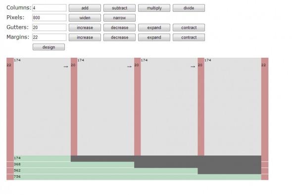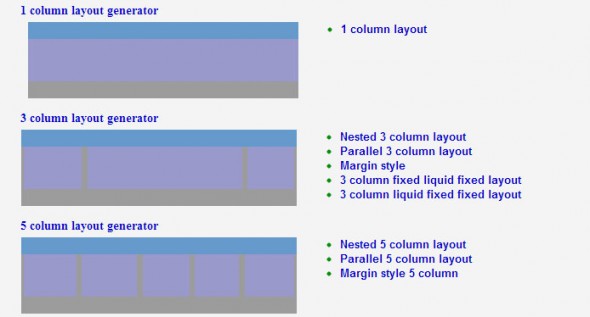 Генератор макетов. Позволяет создавать одно-/двух-/трех-/четырех-/пяти-колоночный макет с плавающей или фиксированной разметкой. Размеры в пикселях, % или em.