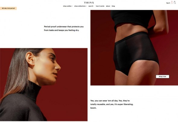 Это то, что происходит на сайте Thinx. Общая цветовая схема страницы — черно-белая. Но на сайте использовано множество фотографий. Особенно в верхней части страницы. Это фотографии нижнего белья на темно-красном фоне. На фоне всего остального фотографии очень заметны. Больше всего выделяется темно-красный цвет. Именно он сильнее всего контрастирует с черно-белой гаммой. Thinx — хороший пример того, что не только яркие неоновые цвета работают на привлечение внимание контрастом. В целом на сайте заметен двух цветов, один из которых помогает выделиться второму.