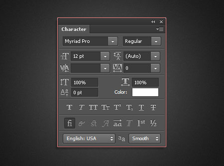 В панели символов (Character Panel) мы изменим такие значения, как цвет и размер шрифта.