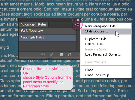Чтобы изменить стиль абзаца, нужно либо дважды кликнуть на его имя в панели Стили абзаца (Paragraph Styles panel), либо выбрать его, а затем перейти в Параметры стилей (Style Options) на панели меню.