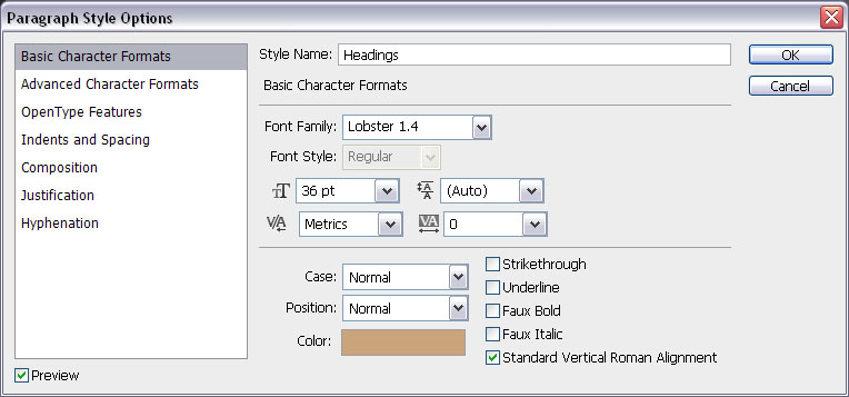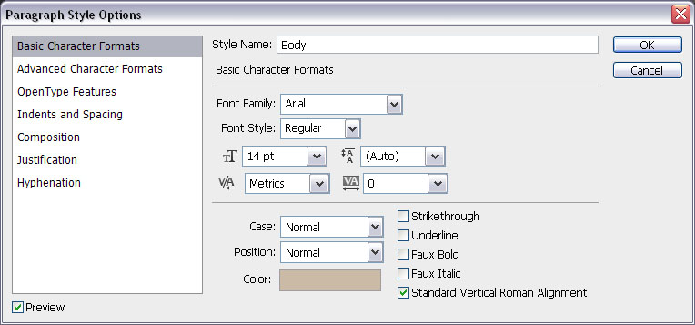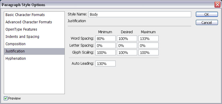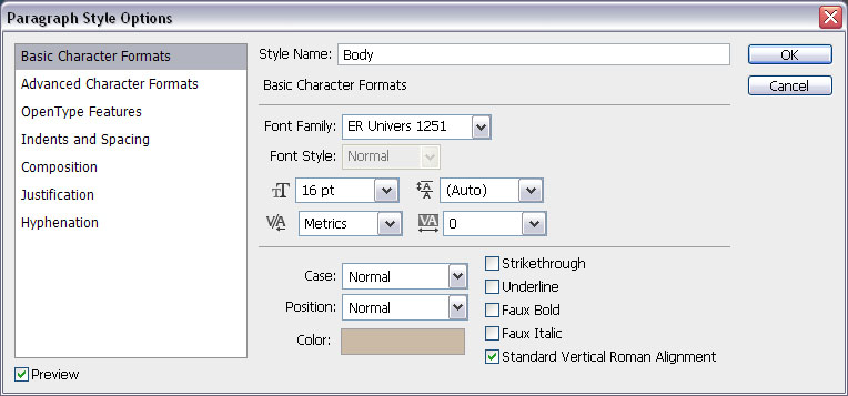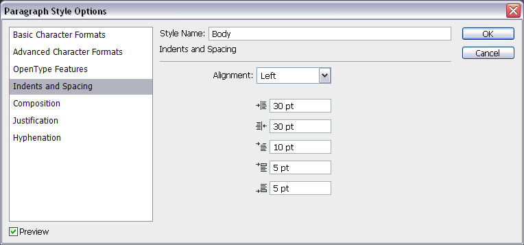 Таким образом вы откроете диалоговое окно стилей абзаца (Paragraph Style Options) , в котором вы можете изменить различные параметры стиля.
