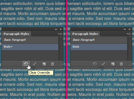 Если вы хотите избавиться от любой коррекции, и вернуться к настройкам оригинального стиля, выберите стиль и нажмите кнопку Очистить изменения (Clear Override) внизу панели Стилей абзаца или нажмите на панели меню Clear Override.