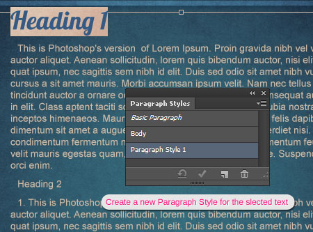 Чтобы создать стили текста, вам нужно создать текст, а затем либо отформатировать его и назначить стиль, который включает в себя все атрибуты, применяемые к этому тексту, либо просто создать стиль, а затем выполнить его форматирование.