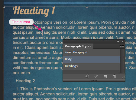 Когда курсор находится внутри текста со стилем «Вody», стиль абзаца будет автоматически выбран в панели стилей абзацев.