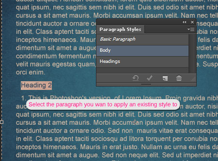 Используется Инструмент Текст (Type Tool), чтобы выделить параграф, к которому вы хотите применить новый стиль абзаца.