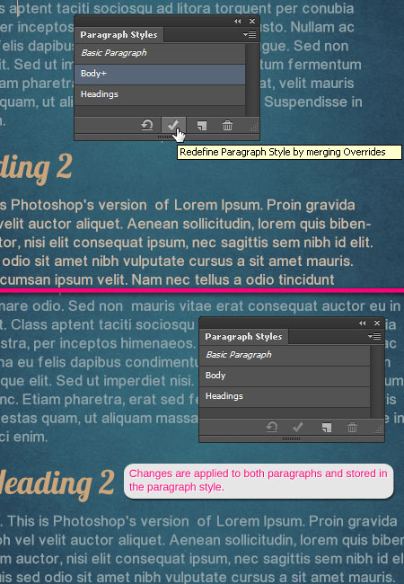 Если вы хотите добавить изменения текущему стилю, так чтобы они заменили настройки этого стиль, вы можете нажать кнопку Redefine Paragraph Style by merging Overrides (иконка внизу панели стилей абзаца) или выбрать на панели меню и выберите Redefine Style.