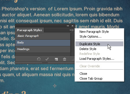 Для этого выберите имя стиля в палитре Стили абзаца (Paragraph Styles), и нажмите в панели меню на Дублировать стиль (Duplicate Style).