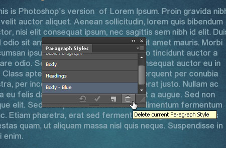 Если вы хотите избавиться от стиля абзаца, нужно выбрать нужный стиль, а затем нажать кнопку Удалить текущий стиль абзаца (Delete current Paragraph Style) (значок внизу панели Стили абзаца) или выберите Удалить стиль (Delete Style) на панели меню.