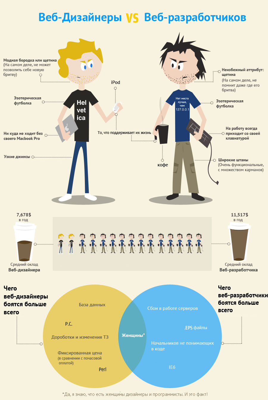 В наше время такие профессии, как веб-дизайнер и веб-разработчик тесно связаны, поэтому многие в них путаются. Как Инь и Янь, представители этих двух специальностей находятся в постоянном сражении, чтобы доказать своё господство друг над другом. Сегодня мы рассмотрим как внешние, так и «внутренние» признаки этих двух подвидов.