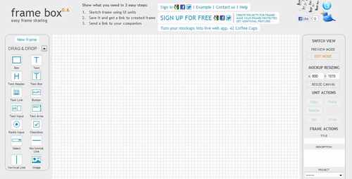 Frame Box — очень простой онлайн инструмент для создания макетов сайтов. Вы очень быстро сможете создать вайрфрейм с использованием ui-элементов, изменять их размеры и даже установить ширину макета. Вы можете поделить своим макетом также в социальных сетях. Достаточно просто и эффективно.