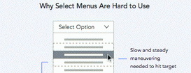 После того, как пользователь открывает выпадающее меню, он должен перемещаться по вариантам и выбрать правильный. Это требует времени и усилий, потому что прочесть эти варианты не так легко. Они появляются в виде длинного списка, и расстояние между строками обычно минимальное.