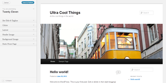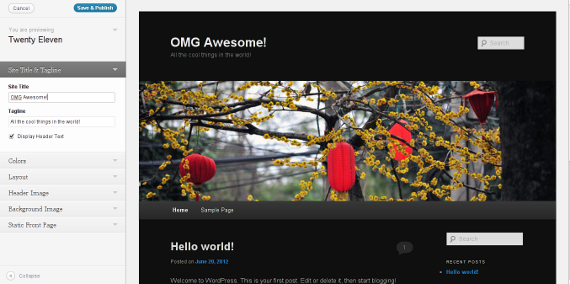 Вы можете изменить название сайта и слоган, изменить цвет, расположение элементов , заголовок изображения, фон и даже отображение главной странице. Конечно, с течением времени, новые темы будут добавлять новые возможности. Давайте посмотрим, как выглядит наше превью после того как мы сделать несколько изменений: