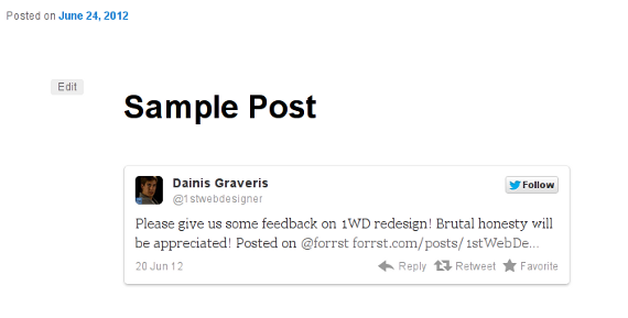 Теперь можно вставлять некоторые твитты при помощи ваших сообщений. Как это работает? Просто скопируйте и вставьте URL в сообщение, а WordPress позаботится об остальном. На самом деле, в WordPress была поддержка oEmbed до версии 2.9 . В версии 3.4 эта функция была также и для твитов,.