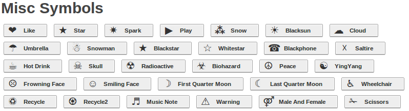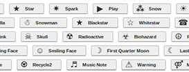 Нравится, Звезда, Искра, Воспроизвести, Снег, Черное солнце, Облако, Зонт, Снеговик, Черная звезда, Белая Звезда, Черный телефон, Косой крест, Горячий напиток, Череп, Радиоактивность, Биологическая опасность, Мир, Инь и Ян, Хмурое лицо, Улыбающееся лицо, Первая четверть луны, Последняя четверть луны, Инвалидная коляска, Переработка, Переработка на черном фоне, Нота, Предупреждение, Мужской и женский символы, Ножницы.