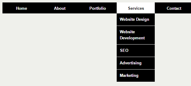 <ul id=nav> <li><a href="">Home</a></li> <li><a href="">About</a></li> <li><a href="">Portfolio</a> <ul> <li><a href="">Website 1</a></li> <li><a href="">Website 2</a></li> <li><a href="">Website 3</a></li> <li><a href="">Website 4</a></li> <li><a href="">Website 5</a></li> </ul> </li> <li><a href="">Services</a> <ul> <li><a href="">Website Design</a> <ul> <li><a href="">HTML</a></li> <li><a href="">CSS</a></li> </ul> </li> <li><a href="">Website Development</a> <ul> <li><a href="">PHP</a></li> <li><a href="">.Net</a></li> <li><a href="">JavaScript</a></li> <li><a href="">jQuery</a></li> </ul> </li> <li><a href="">SEO</a></li> <li><a href="">Advertising</a></li> <li><a href="">Marketing</a></li> </ul> </li> <li><a href="">Contact</a></li> </ul>