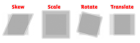 Большинство современных браузеров поддерживают свойство трансформаций без приставки производителя, но браузеру Internet Explorer версии 9, современным версиям браузеров Blackberry Browser и UC Browser for Android понадобятся соответствующие приставки производителей. Основные функции трансформаций — поворот, наклон, масштабирование и сдвиг, с возможностью сокращенной записи всех четырех вместе. Во многих случаях масштабирование и сдвиг являются просто удобными альтернативами изменению свойств положений левого, верхнего, правого и нижнего краев и ширины и высоты, но поворот и наклон предоставляют полностью новые возможности.