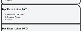 <div id="bestanime"> <h3>Top Three Anime DVDs</h3> <ol> <li>Ghost In The Shell <li>Spirited Away <li>Akira </ol> </div>