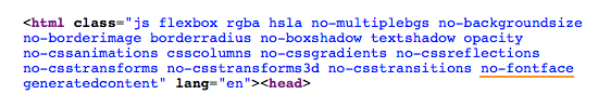 К счастью, библиотека JavaScript под названием Modernizr может помочь решить вышеописанные сложности. Modernizr — это библиотека JavaScript, которая определяет, какие свойства CSS3 поддерживаются браузером. После чего добавляется класс CSS в элемент <html>, чтобы показать, поддерживаются ли свойства. Например, если свойство @font-face не поддерживается, добавится класс no-fontface в элемент <html>, т. е. <html class="no-fontface">. Эти классы CSS добавляются с помощью JavaScript, они не видны в исходном коде. Чтобы увидеть их, нужно исследовать элемент страницы или посмотреть созданный код.