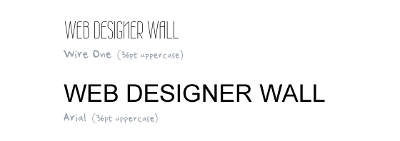 Так как у каждого шрифта свои ширина, высота, толщина, расстояние между символами и т. д., то некоторые шрифты невозможно заменить присутствующими во всех системах шрифтами. Давайте рассмотрим пример ниже. Это сравнение нестандартного шрифта Wire One и присутствующего во всех системах шрифта Arial размера 36 точек и всеми заглавными буквами.