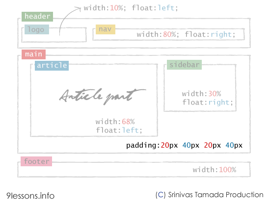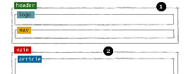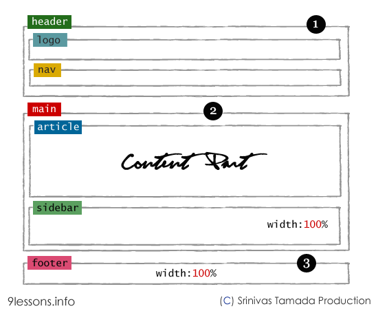 <div id="header"> 1 Header <div id="logo">logo</div> <div id="nav">links</div> </div> <div id="main"> 2 Main <div id="article">article</div> <div id="sidebar">sidebar</div> </div> <div id="footer"> 3 Footer </div>