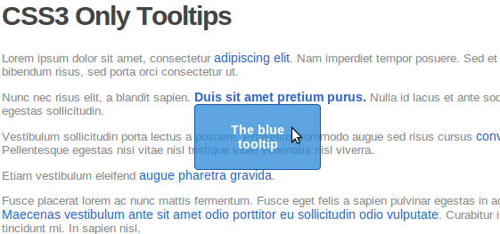 <a href="">Duis sit amet pretium purus.<span class="blue">The blue tooltip</span> <a href="">convallis egestas felis suscipit<span class="red">The red tooltip</span></a> <a href="">augue pharetra gravida<span class="yellow">The yellow tooltip</span></a> <span class="green">The green Tooltip</span></a>